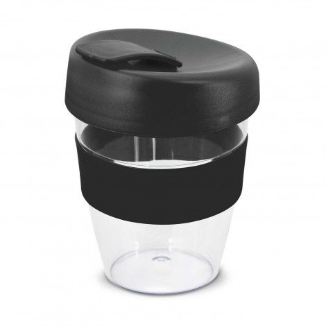 LargeCrystal-clear 350ml reusable coffee cup with a heat-resistant silicone band and a secure screw on lid with a splashproof flip closure. The cup is manufactured from AS plastic and the lid is polypropylene. Both materials are BPA-free. The lid, flip closure and band can be mixed and matched in any colour combination from the standard colours at no extra cost. Up to five different colour combinations are included in the price and more are available for an additional charge. It can be presented in an optional black gift box on request. This product is not dishwasher safe and handwashing is recommended. Express Cup Claritas is protected under New Zealand Design Registration No. 419451 and Australian Design Registration No. 361937.