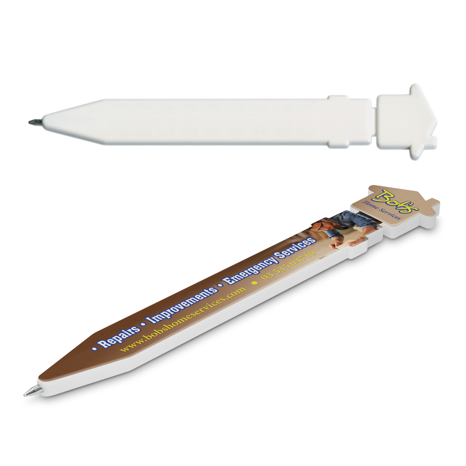Plastic ball pen with a house-shaped top and a magnetic reverse side so it can be stored on a fridge or other metal surfaces. It has a black refill with 800 metres of writing ink.