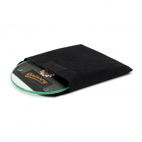 Round glass coaster which is presented in a smart velvet sleeve with a Velcro closure. It has three soft non-skid, non-marking polyurethane pads on the base. Handwashing is recommended.